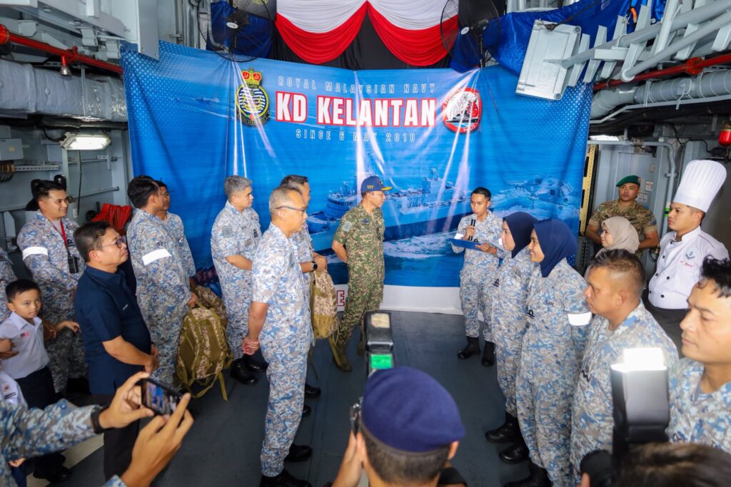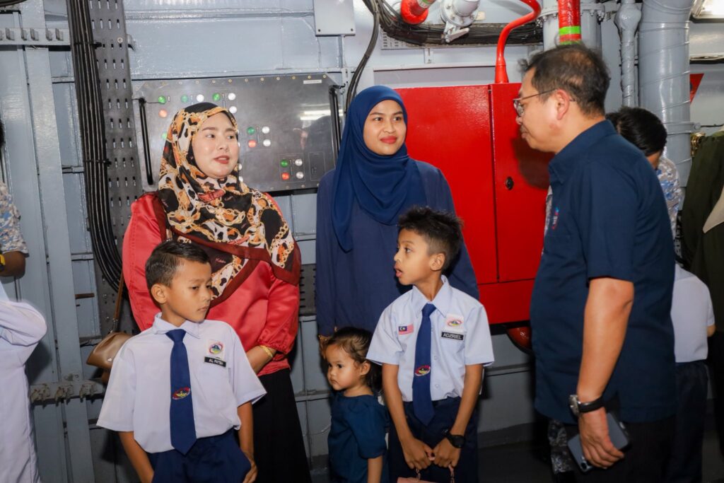 Turut mengiringi YBhg. Laksamana Madya Dato’ Khir Junaidi, Panglima Armada Timur TLDM, YBhg. Dato’ Dr. Mohd Nizar bin Hj. Sudin, Ketua Eksekutif Yayasan LTAT, YBrs. Kapten Mohd Fauzi bin Sabtu, Pegawai Memerintah KD Kelantan serta YBrs. Puan Muliati binti Kamaruddin, Pengarah PTPTN Negeri Sabah.